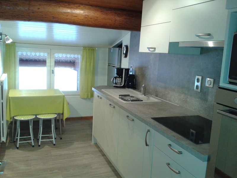 The integrated kitchen side is equipped with a sink with cold and hot water mixer. 1 induction hob, 1 extractor hood, an electric oven and a microwave oven, 1 refrigerator with 2 doors, 197 liter fridge + 52 liter freezer, dishwasher. Complete kitchenware. Pressure cooker, electric coffee maker, kettle, toaster, raclette machine, fondue bourguignonne machine.