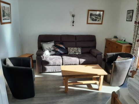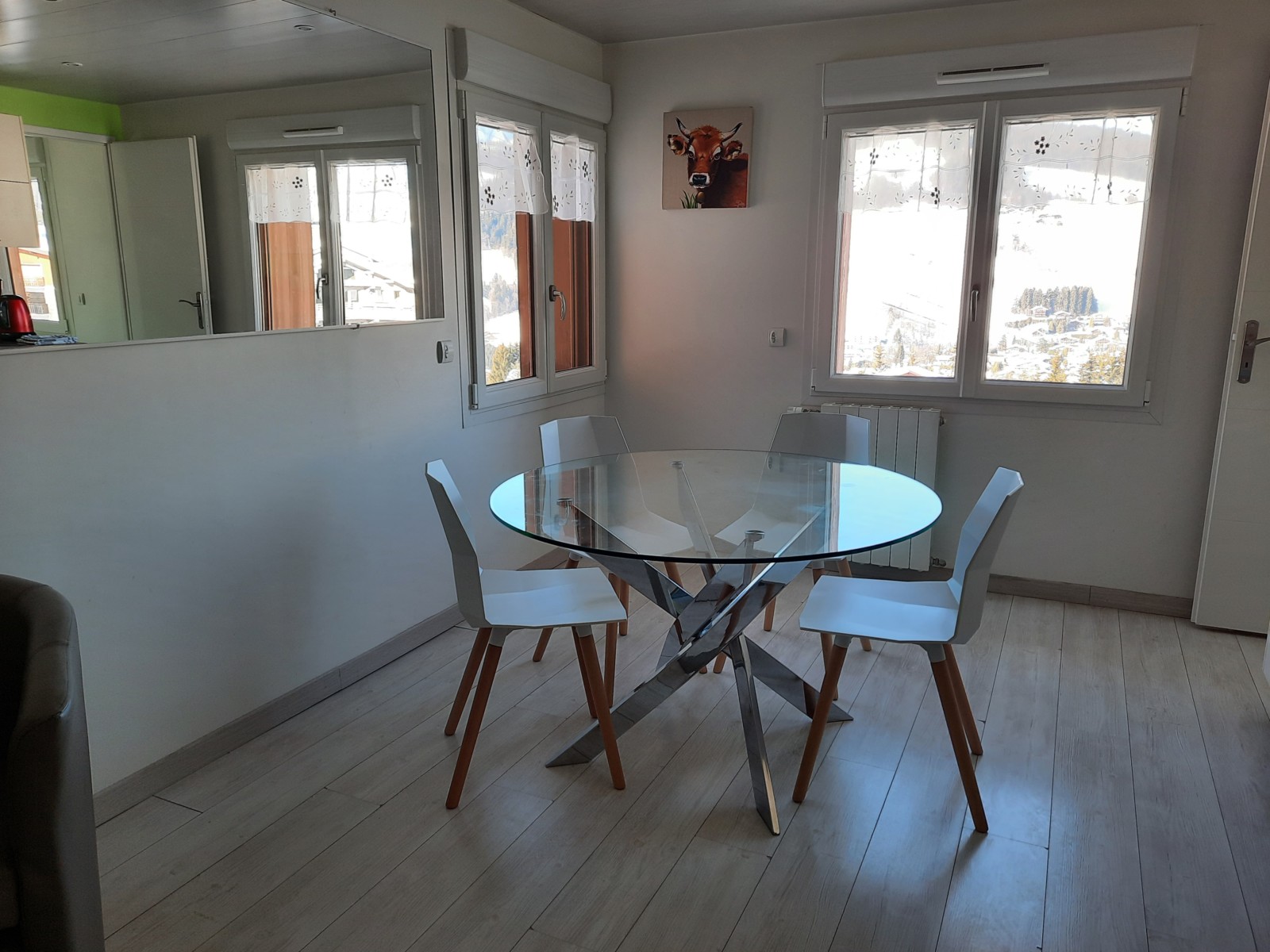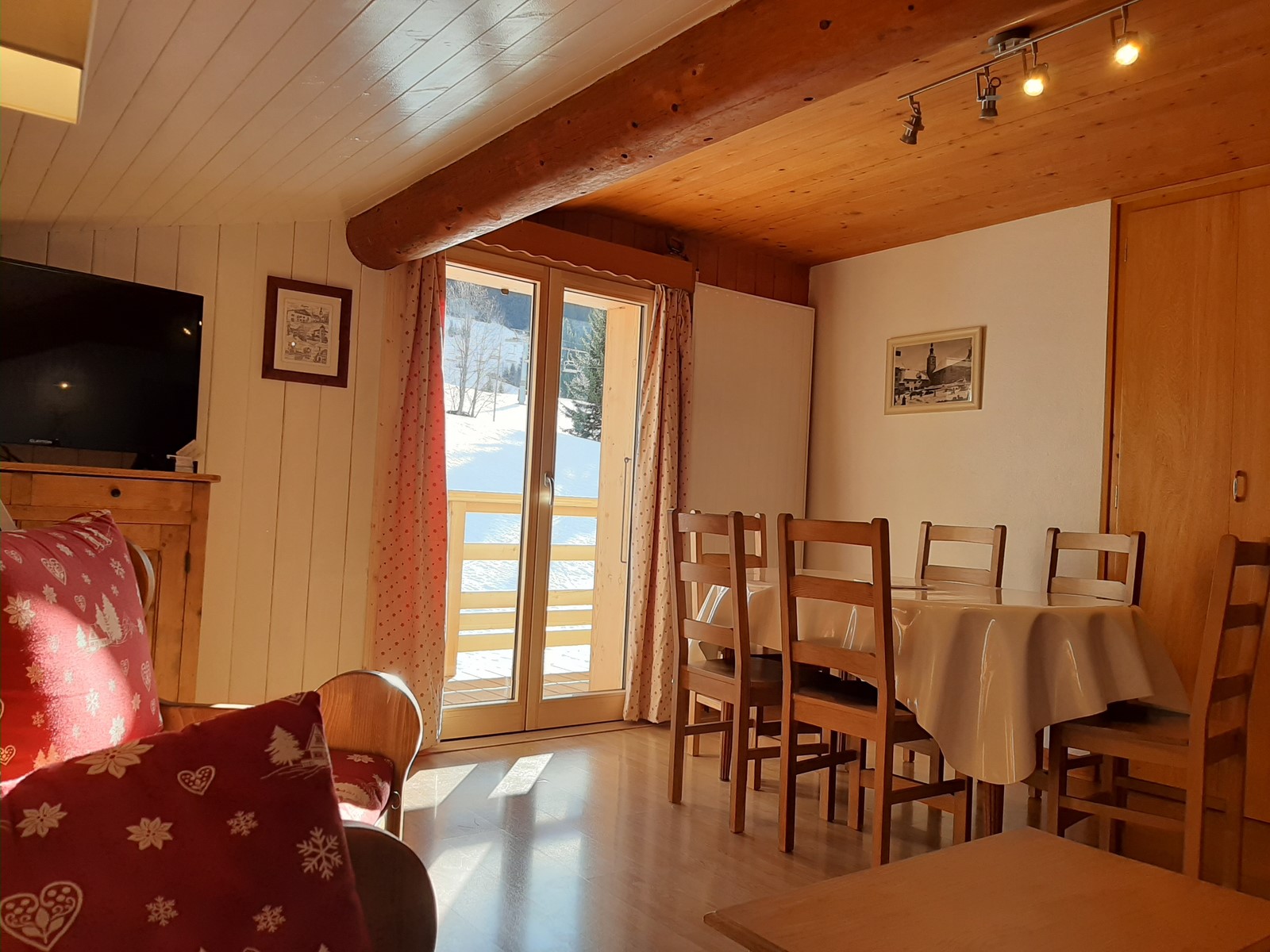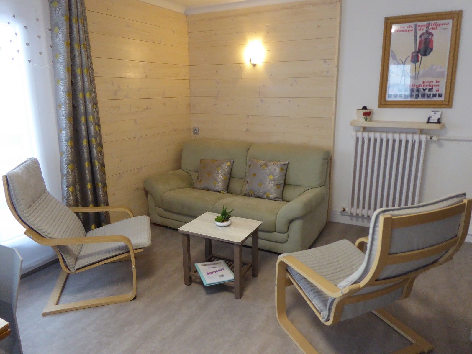 The living room, facing south and west, with a view of the Aravis and Rochebrune mountains, has a table with 6 chairs, a coffee table, two armchairs, 1 sofa. 100 cm flat screen color television, with HD Freeview, DVD player and USB port.
