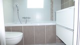 A second bathroom has a bathtub, a washbasin and a toilet.